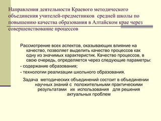 Документ обсуждает обновление содержания школьного образования и повышение его качества в Алтайском крае через научно-методическую и опытно-экспериментальную работу. Ключевыми аспектами являются совершенствование учебно-методического обеспечения, выявление потребностей учащихся и использование новых учебно-методических комплексов. Методические объединения учителей играют важную роль в адаптации содержания образования и организации мероприятий для повышения квалификации педагогов.