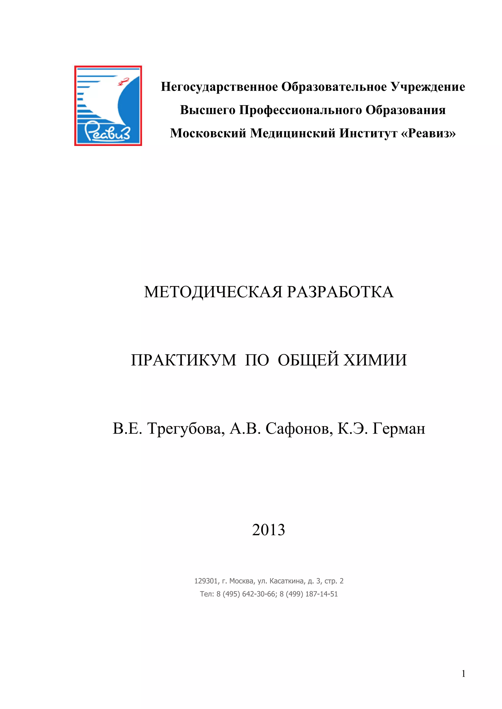 Документ является методической разработкой практикума по общей химии, состоящей из различных лабораторных работ, направленных на изучение химических и физико-химических методов анализа. Включает теоретические введения, подробные описания методики и использование лабораторного оборудования для определения содержания витаминов, редуцирующих веществ и других компонентов в продуктах. Утвержден на заседании кафедры и предоставляет структурированное руководство по оформлению и проведению лабораторных работ.