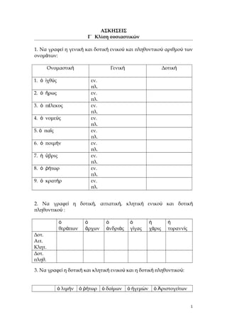 1.Να γραφεί η γενική και δοτική ενικού και πληθυντικού αριθμού των