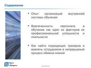 Документ описывает внедрение внутренней системы обучения в организации, акцентируя внимание на вовлеченности сотрудников как факторе профессиональной успешности. Приводятся статистические данные, описываются программы тренингов, и отмечаются проблемы, такие как плохая посещаемость. Также подчеркивается важность подготовки тренеров и обмена знаниями внутри компании.