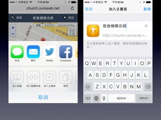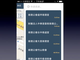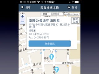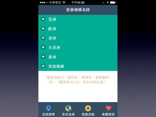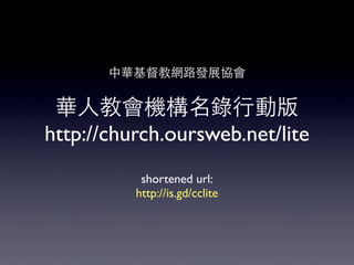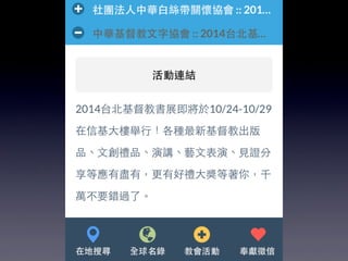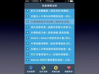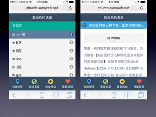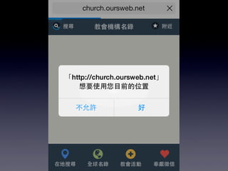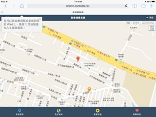 本文档介绍了中华基督教网络发展协会的华人教会机构名录行动版,提供了可通过GPS定位功能在移动设备上搜索教会和机构的信息。用户可以通过关键字和地址快速查找附近的教会,并支持简体中文。还包括应用安装和网页添加到主屏幕的指导。