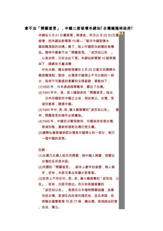 ) 本網站 5 月 21 日遭破壞,修復後,昨天(5 月 25 日)又遭 破壞,把本網站新聞第 15 號––「駁斥中國對陳水 扁就職演說的回應」撕下,貼上中國對台統戰的宣傳 品。證明中國拿不出「開羅宣言、「波茨坦公告 」 」 ,心急如焚,只好出此下策。本網站新聞第 15 號原稿 如下,請網友大量流傳: 中央台辦、國台辦經授權在 5 月 20 日當天回應陳水 扁就職演說,堅持,台灣是中國領土不可分割的一部 分,具有不可動搖的事實和法理基礎,要點如下: (1)1895 年,日本通過侵華戰爭,霸佔了台灣。 (2)1943 年中、美、英 3 國發表的「開羅宣言」指出, 日本所竊取於中國之土地,例如東北、台灣、澎 湖列島等,歸還中國。 (3)1945 年中、 英、 4 國簽署的 美、 蘇 「波茨坦公告」 重 申,開羅宣言的條件必將實施。 (4)1945 年,中國抗日戰爭勝利,中國政府收復台灣、 澎湖列島,重新恢復對台灣行使主權。 (5)國際社會普遍承認台灣是中國領土的一部分,執行 一個中國的政策。 反駁: (1)台灣乃台灣人祖先所開墾,與中國人無關,想霸佔 台灣的反而是共匪。 (2)所謂的「開羅宣言」,經本人數年的查證,無人簽 字,若有,共匪可拿出來讓大家看看。 (3)世界上不存在中、美、英、蘇 4 國簽署的「波茨坦 公 告」,若有,共匪可提出。而只有美國簽署的 「波茨坦公告」,是規定日本遵照開羅協議,放棄 包括台灣、澎湖在內的海外殖民地,並且承諾,依 照聯合國憲章第 76 及 77 條,讓台灣、澎湖經由託管 、自治、獨立。