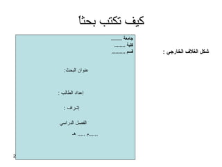 يوفر الوثيقة إرشادات شاملة حول كتابة الأبحاث ومشاريع التخرج، مع تقديم معلومات حول هيكل البحث، ومحتوياته، وأهمية البحث، وكذلك كيفية تحديد مشكلة البحث وأهدافه. تتناول الوثيقة أيضًا الفرضيات، والمنهجيات، ومصادر المعلومات، بالإضافة إلى كيفية تحليل البيانات وكتابة النتائج والتوصيات. يتضمن أيضًا نصائح حول إعداد المراجع وتوثيق المصادر المستخدمة في البحث.
