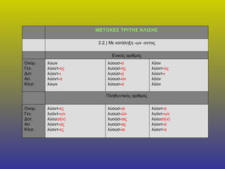 λύοντ- α λυόντ-ων λύου σι(ν) λύοντ- α λύοντ- α λύουσ- αι λυουσ- ῶν λυούσ- αις λυούσ- ας λύουσ- αι λύοντ- ες λυόντ- ων λύου σι(ν) λύοντ- ας λύοντ- ες Ονομ. Γεν. Δοτ. Αιτ. Κλητ. Πληθυντικός αριθμός λῦον λύοντ- ος λύοντ- ι λῦον λῦον λύουσ- α λυούσ- ης λυούσ- ῃ λύουσ- αν λύουσ- α λύων λύοντ- ος λύοντ- ι λύοντ- α λύων Ονομ. Γεν. Δοτ. Αιτ. Κλητ. Ενικός αριθμός 2. 2 .) Με κατάληξη - ων - οντος ΜΕΤΟΧΕΣ ΤΡΙΤΗΣ ΚΛΙΣΗΣ - 3.