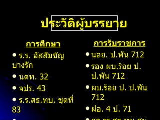 การศึกษา ร .ร . อัสสัมชัญ บางรัก นตท . 32 จปร . 43 ร . ร . สธ . ทบ . ชุดที่ 83 ร . ร . สธ . ทบ . อเมริกา ประวัติผู้บรรยาย การรับราชการ นอย . ป . พัน 712 รอง ผบ . ร้อย ป . ป . พัน 712 ผบ . ร้อย ป . ป . พัน 712 ฝอ . 4 ป . 71 อจ . รร . สธ . ทบ . สบส . - 3.