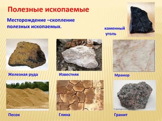 Презентация ученика Ильи Мирошниченко подробно описывает полезные ископаемые, их свойства и применение в строительстве и других отраслях. Рассматриваются различные виды полезных ископаемых, включая гранит, мрамор, глину, песок, торф, уголь, железную руду и нефть, а также их добыча и использование. Представлены интересные факты о каждом ископаемом и их роли в жизни человека.