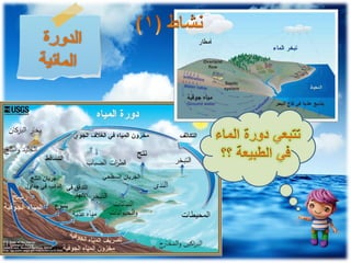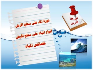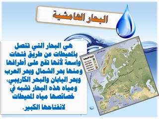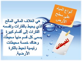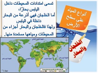 الوثيقة تتناول موضوع مياه البحار والمحيطات، مشيرة إلى مكونات مثل ملوحة ودرجة حرارة وكثافة المياه. كما تحتوي على معلومات حول نسب تواجد الغطاءات الجليدية والمائية. وتطرح أسئلة لتفسير التباينات في الخصائص الفيزيائية لمياه البحر.