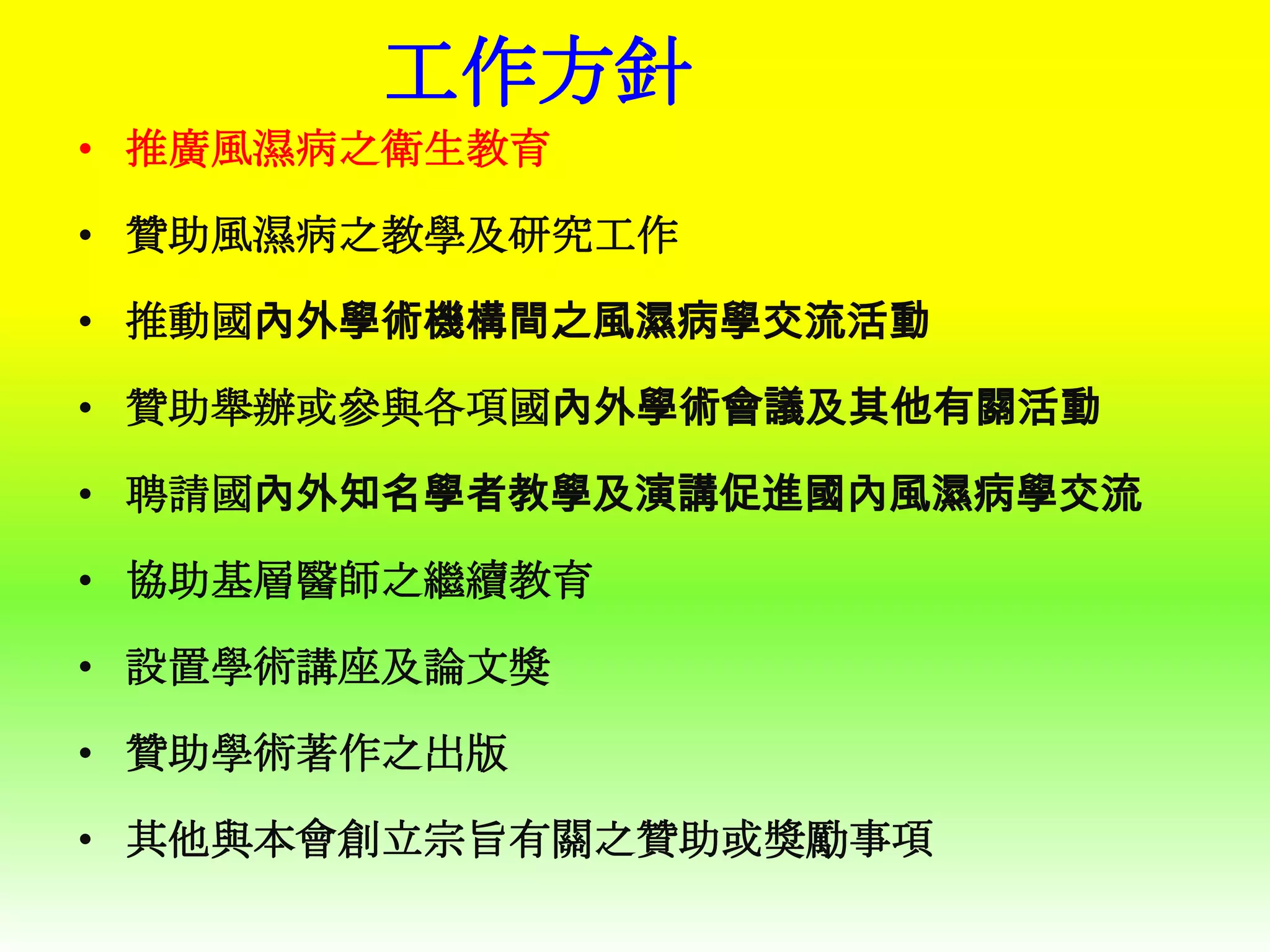 本文概述了風濕免疫科的工作方針和主要任務,包括推廣風濕病衛生教育、贊助相關教學研究及國際交流。免疫系統在對抗疾病中扮演重要角色,並隨文介紹了各類風濕病的症狀及治療方法。最后,介紹了相關專家的背景及其在風濕病領域的實踐經驗。