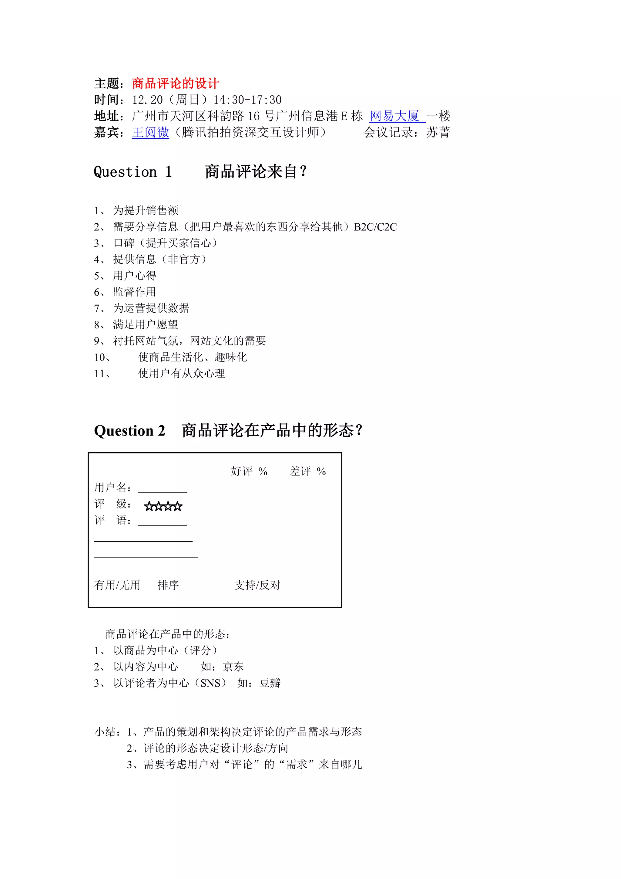 E 栋 网易大厦 一楼 嘉宾:王阅微(腾讯拍拍资深交互设计师) 会议记录:苏菁 Question 1 商品评论来自? 1、 为提升销售额 2、 需要分享信息(把用户最喜欢的东西分享给其他)B2C/C2C 3、 口碑(提升买家信心) 4、 提供信息(非官方) 5、 用户心得 6、 监督作用 7、 为运营提供数据 8、 满足用户愿望 9、 衬托网站气氛,网站文化的需要 10、 使商品生活化、趣味化 11、 使用户有从众心理 Question 2 商品评论在产品中的形态? 好评 % 差评 % 用户名: 评 级: 评 语: 有用/无用 排序 支持/反对 商品评论在产品中的形态: 1、 以商品为中心(评分) 2、 以内容为中心 如:京东 3、 以评论者为中心(SNS) 如:豆瓣 小结:1、产品的策划和架构决定评论的产品需求与形态 2、评论的形态决定设计形态/方向 3、需要考虑用户对“评论”的“需求”来自哪儿