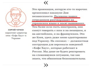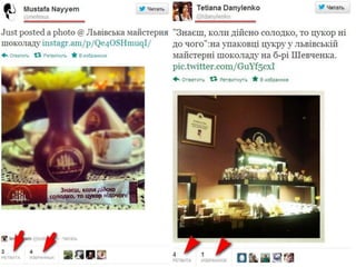 Документ обсуждает влияние работы с лидерами мнений и адвокатами бренда в сфере социальных медиа на бизнес. Представлены примеры практической работы, такие как твиты и ретвиты, как способ взаимодействия с аудиторией. Основной акцент сделан на важности учета отзывов клиентов в бизнесе.