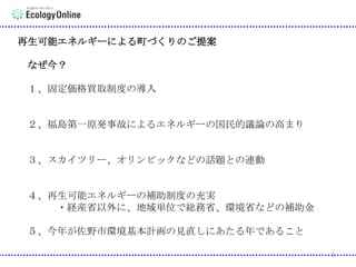 再生可能エネルギーによる町づくりのご提案 なぜ今? 1、固定価格買取制度の導入 2、福島第一原発事故によるエネルギーの国民的議論の高まり 3、スカイツリー、オリンピックなどの話題との連動 4、再生可能エネルギーの補助制度の充実 ・経産省以外に、地域単位で総務省、環境省などの補助金 5、今年が佐野市環境基本計画の見直しにあたる年であること 2