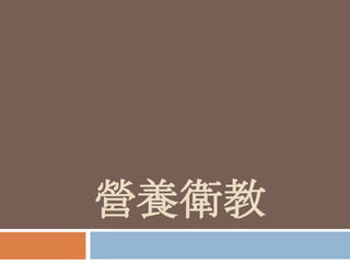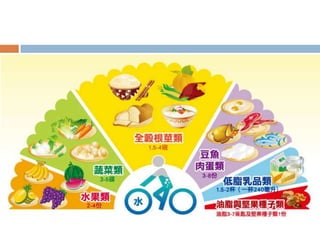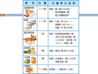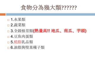 食物分為幾大類?????? 1.水果類 2.蔬菜類 3.全穀根莖類(熱量高!! 地瓜、南瓜、芋頭) 4.豆魚肉蛋類 5.低脂乳品類 6.油脂與堅果種子類