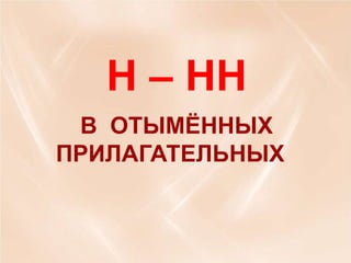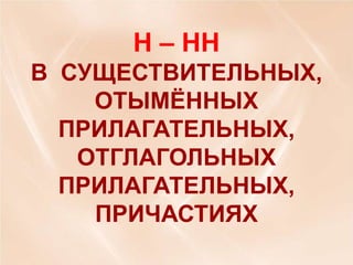 Документ подробно описывает правила написания суффиксов н и нн в прилагательных, отглагольных прилагательных и причастиях. Приведены примеры, исключения и различия в использовании этих суффиксов в различных грамматических формах. Рассматриваются случаи образования прилагательных и существительных с акцентом на их морфологические особенности.