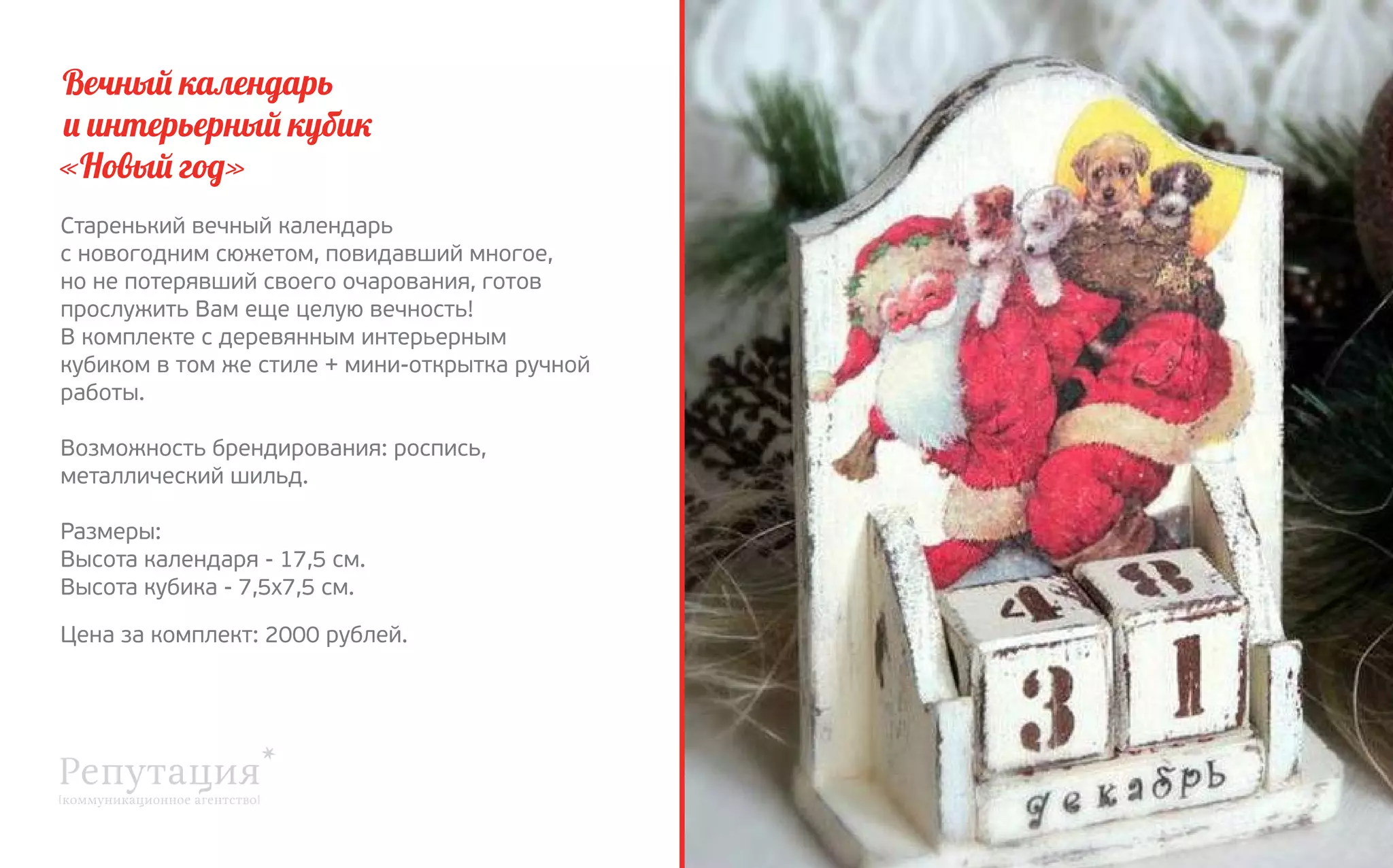 Документ представляет ассортимент новогодних подарков и сувениров, включая деревянные елочные игрушки, объемные украшения и сладкие угощения. Предоставлены подробные описания, размеры и цены на различные товары, а также возможность брендирования. Продукция предназначена как для подарков, так и для украшения интерьера в преддверии новогодних праздников.