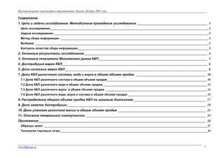 Итоговый отчет декабря 2002 года о розничных продажах каш быстрого приготовления на московском рынке описывает методологию исследования и его результаты. Общий объем рынка составил 21,9 млн рублей, с марками "Быстров" и "Бишоп" как лидерами по дистрибуции и доле рынка. Документ также анализирует различные сегменты рынка по ценовым категориям, вкусам и составам каш.