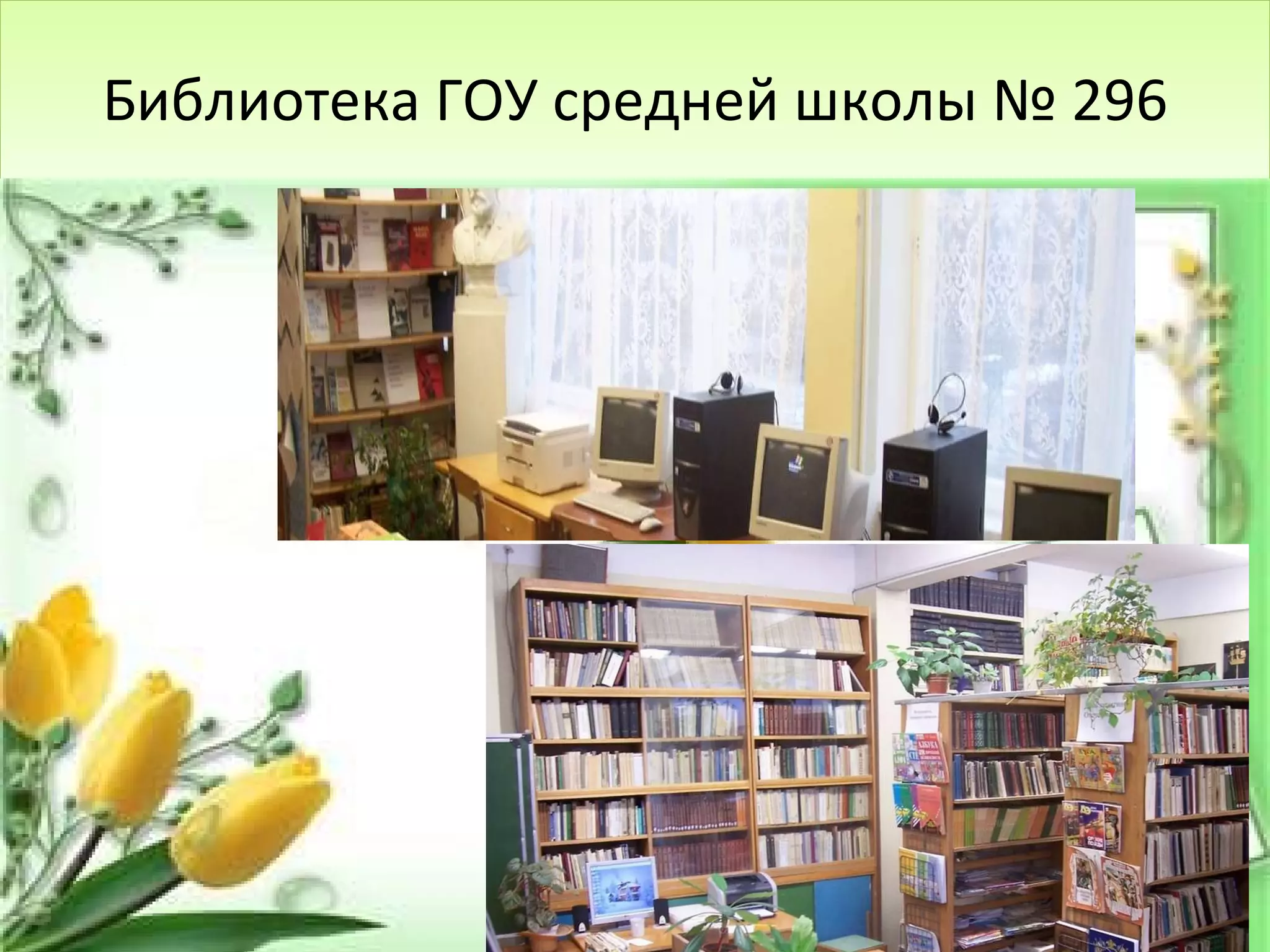 Документ описывает мероприятия библиотеки гоу средней школы № 296 Санкт-Петербурга, включая уроки и выставки, проведенные для различных классов. В частности, упоминаются интегрированные уроки и творческие работы учащихся, посвященные литературе и истории. Также отмечено участие библиотекарей в методических объединениях и семинарах по инновационным технологиям в библиотечном деле.