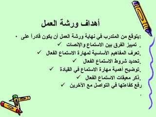 تتناول ورشة العمل موضوع فن الاستماع وأهدافها تدريس مهارات الاستماع الفعال، حيث يتعلم المشاركون الفرق بين الاستماع والإنصات وأهمية هذه المهارة في القيادة والتواصل. تتضمن الورشة شروط الاستماع الجيد وتقنيات التركيز، كما تبرز ثمرات الاستماع الفعال وأثره الإيجابي في سياق العمل الجماعي وتفهم الآخرين.