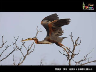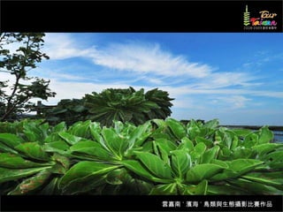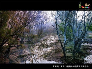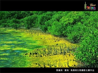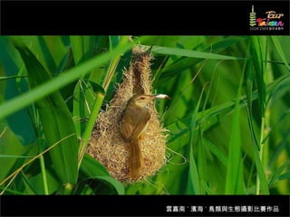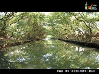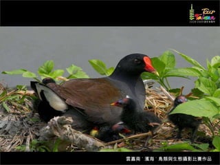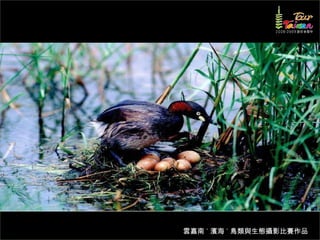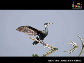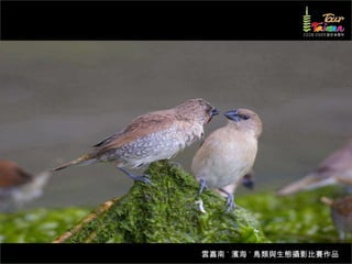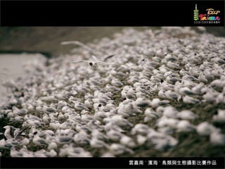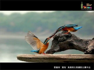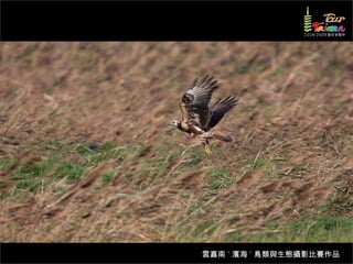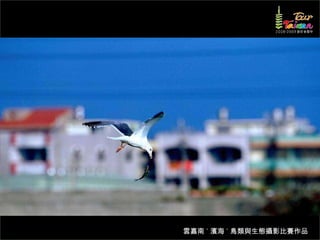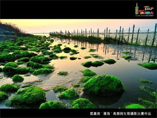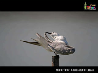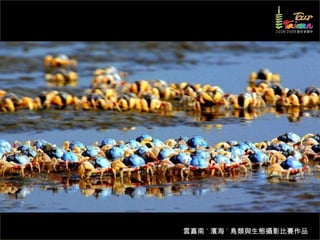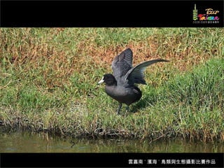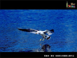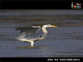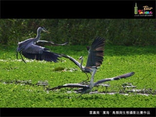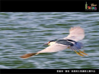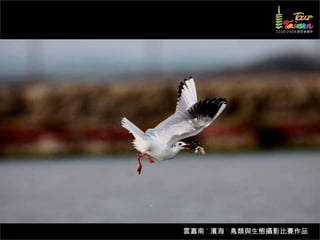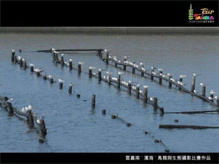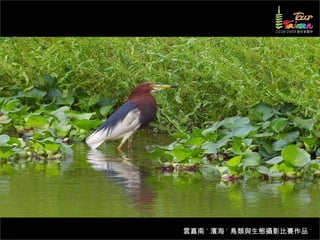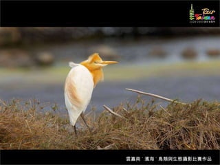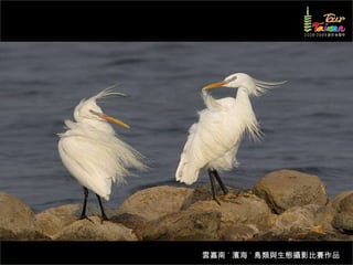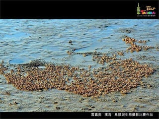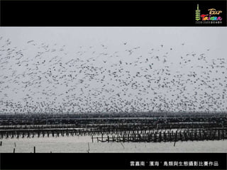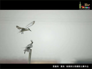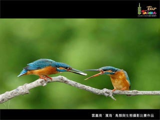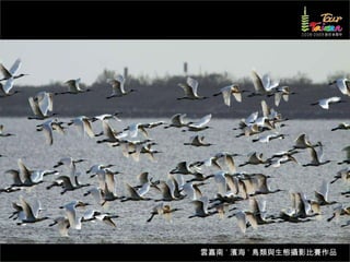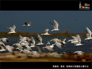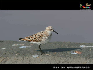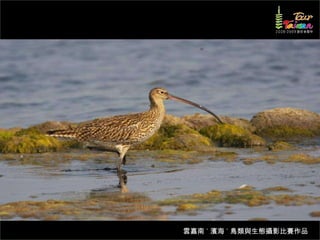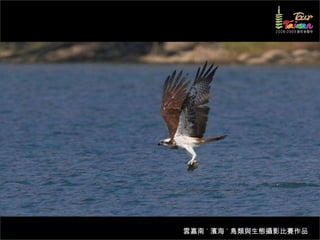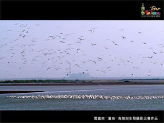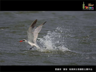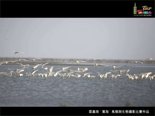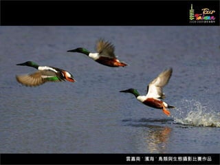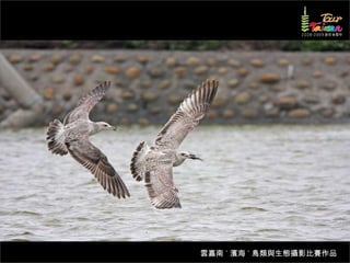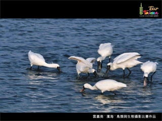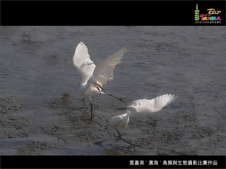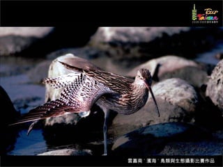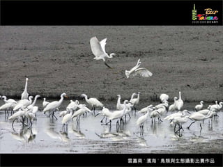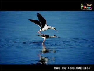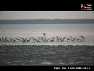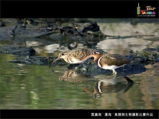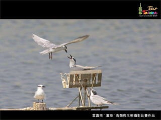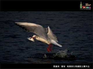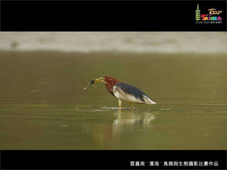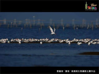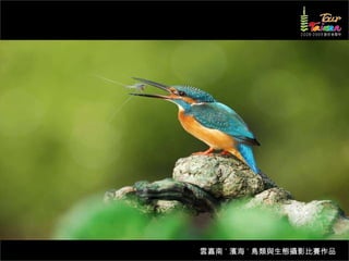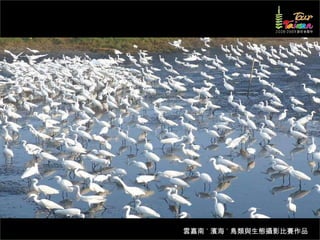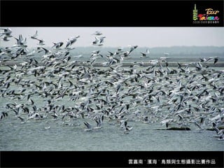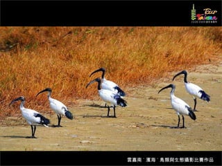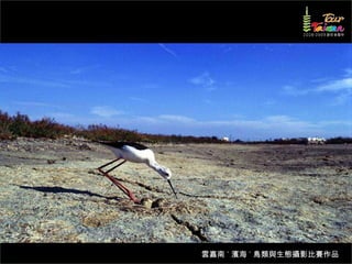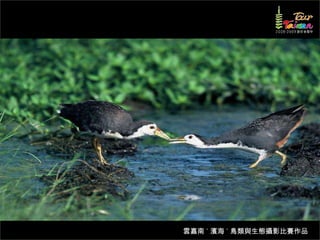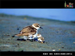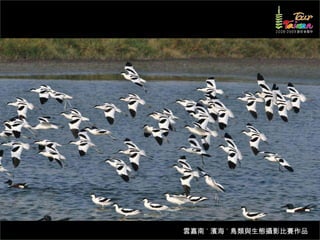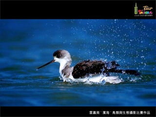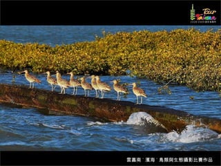 文档介绍了生態攝影比賽的結果和生態環境,特别是雲嘉南沿海的鸟类。金牌、银牌和铜牌获奖作品分别表现了翠鳥、白鷺和鸕鶿的独特瞬间,展现了对自然界的真实观察。文档还讨论了不同鸟类(如鷺鷥、鴴科、鷸科等)的生态特征及习性。