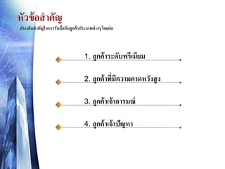 โดยย่ อ 1. ลูกค้ าระดับพรี เมียม 2. ลูกค้ าทีมความคาดหวังสู ง ่ ี 3. ลูกค้ าเจ้ าอารมณ์ 4. ลูกค้ าเจ้ าปัญหา