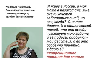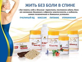 Документ предлагает решения для снижения болей в спине через коррекционное питание и массаж с использованием крема на основе пчелиного яда. Автор делится личным опытом о том, как заботиться о здоровье близких, подчеркивая важность правильного питания и физической активности. Упоминается, что здоровье позвоночника влияет на общее самочувствие и качество жизни.