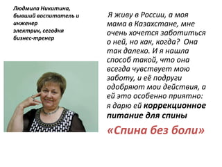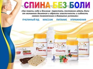 Документ предлагает способы помощи близким в лечении и предотвращении болей в спине, используя коррекционное питание, крем на основе пчелиного яда и упражнения. Автор делится личным опытом заботы о своей матери, находящейся далеко, через подарки, способствующие здоровью позвоночника. Подчеркивается важность заботы о близких и профилактики заболеваний спины для общего благополучия.