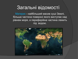 В презентації наведені основні поняття, що можуть стосуватись теми "Материк". Для наочності використовуються карти світу, таблиці, діаграми та об'єкти Smart.
