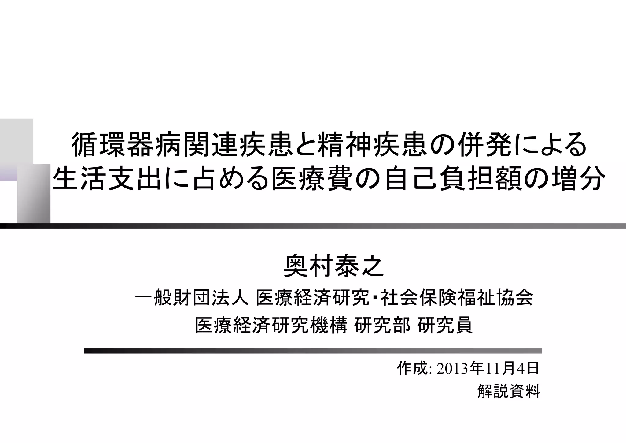 肥満症,心筋梗塞,高血圧症の外来患者が,精神疾患を併発すると,生活費に占める医療費の自己負担の割合が2.5倍以上増える