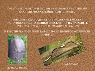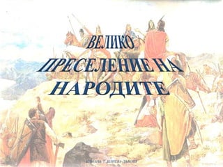 Документ описва Великото преселение на народите, започнало през IV век, когато хуните и последвалите ги германски и славянски племена нахлуват в Римската империя. Хуните първи търсят нови територии за заселване, следвани от германците, които създават свои държави в западна Европа. В текста се подчертават важни въпроси относно миграцията на различните народи и тяхната съдба на Балканите.