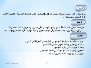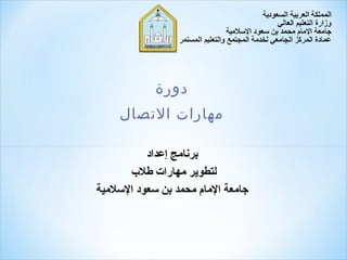تتناول الدورة التدريبية لمهارات الاتصال في جامعة المام محمد بن سعود أهمية تطوير المهارات اللغوية اللازمة للتواصل الفعال. تشمل أهداف الدورة تعريف المتدربين بأسس الاتصال، أنواع ووسائل الاتصال، وكيفية تنمية مهارات الاستماع، التحدث، الكتابة، والقراءة. كما تهدف الدورة إلى توثيق الروابط بين الجامعة والمجتمع من خلال تقديم خدمات تدريبية مهنية وعالية الجودة.