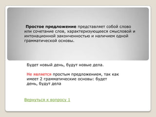Документ объясняет, что простое предложение характеризуется смысловой и интонационной законченности с одной грамматической основой. Обсуждаются примеры простых предложений, сложноподчиненных и безличных, включая их определение и критерии. Документ также уточняет, какие предложения не соответствуют данным определениям.
