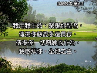 文档探讨了上帝的爱的体现,并通过诗歌表达对神的敬拜与祈求。内容包括对心灵洁净的渴望和面对生活挑战时的信念。强调祈祷和相信神的应许能带来胜利和勇气。