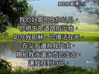 華 )2-1 神啊!求你為我造清潔的心, 使我裡面重新有正直的靈, 不要丟棄我使我離開你的面, 不要從我收回你的聖靈。 求你使我仍得救恩之樂, 賜我樂意的靈來扶持我, 你的杖,你的竿,領我到你面前, 使我走正義路。