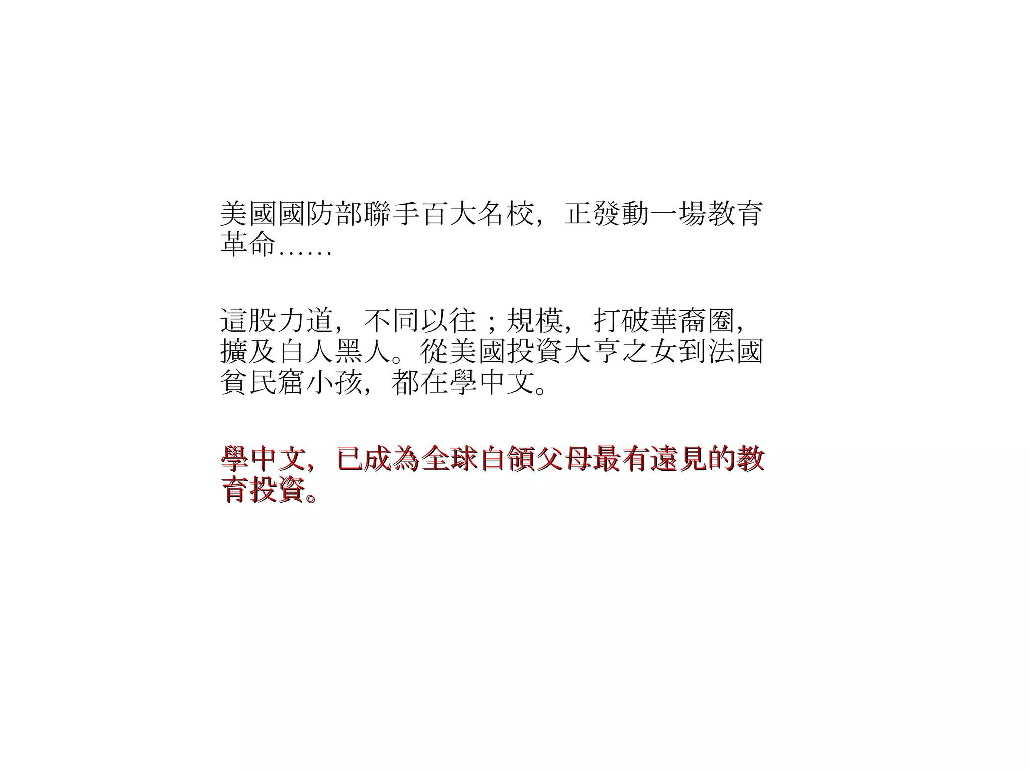 美國國防部和名校聯手推動中文學習的熱潮,使學中文成為全球白領父母的主要教育投資,而台灣孩子的中文能力卻日漸下降。文中指出學習語言的迷思,強調母語的基礎和學習雙語的重要性,以適應未來的全球競爭。只有在提升中文能力後,才能更有效地學習其他語言。