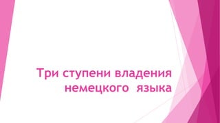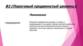 Документ описывает три уровня владения немецким языком: B2, C1 и C2. На уровне B2 пользователи могут понимать сложные доклады и активно участвовать в обсуждениях, на уровне C1 - выражать сложные мысли и идеи с точностью, а на уровне C2 - свободно общаться и писать на любые темы. Каждый уровень характеризуется специфическими навыками в понимании, говорении и письме.