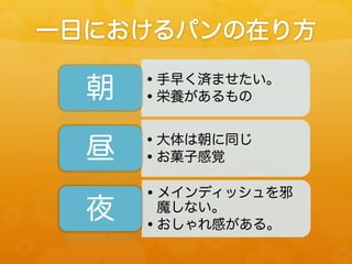 一日におけるパンの在り方 朝 • 手早く済ませたい。 • 栄養があるもの 昼 • 大体は朝に同じ • お菓子感覚 夜 • メインディッシュを邪 魔しない。 • おしゃれ感がある。