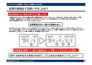アプリアイデア企画部門 作品名 相場師・なり夫の話 投資の勉強をする前にやることは? 株式投資をしない理由の第1位は「難しいそう」 投資を始めるに当たって様々な知識が必要。決算書の読み方、PER/PBR、チャートの見方など、初心者には確かに難しい。投資 の知識は、企業評価のやり方と売買タイミングの取り方でしかない。これらの知識を得たとしても投資に成功するとは限らない。 実は投資知識を学ぶ前に、もっとやることがある。それは・・・ 産業構造を知る=儲けの連鎖を追う! 昔、庭になっていたリンゴをジュースにして近所に売っている人がいました。この時代、儲けたのはジュースを作って売った人だけでした。 しかし、社会が発展していくにつれて分業化が進み、儲けが連鎖していきました。この儲けの連鎖を見つけることが、投資をするにあたって 最も重要なことである。そして儲けの連鎖とは、産業構造そのものである。 産業構造を紐解いて、儲けの連鎖を追って、投資シナリオを作ることが重要! 質問:自動車会社の業績が好調なら、どんな会社の業績がいいでしょうか? 東京証券取引所主催