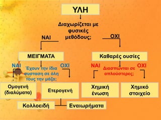 δ) Τα μείγματα διαχωρίζονται στα συστατικά τους με φυσικές μεθόδους(π.χ.