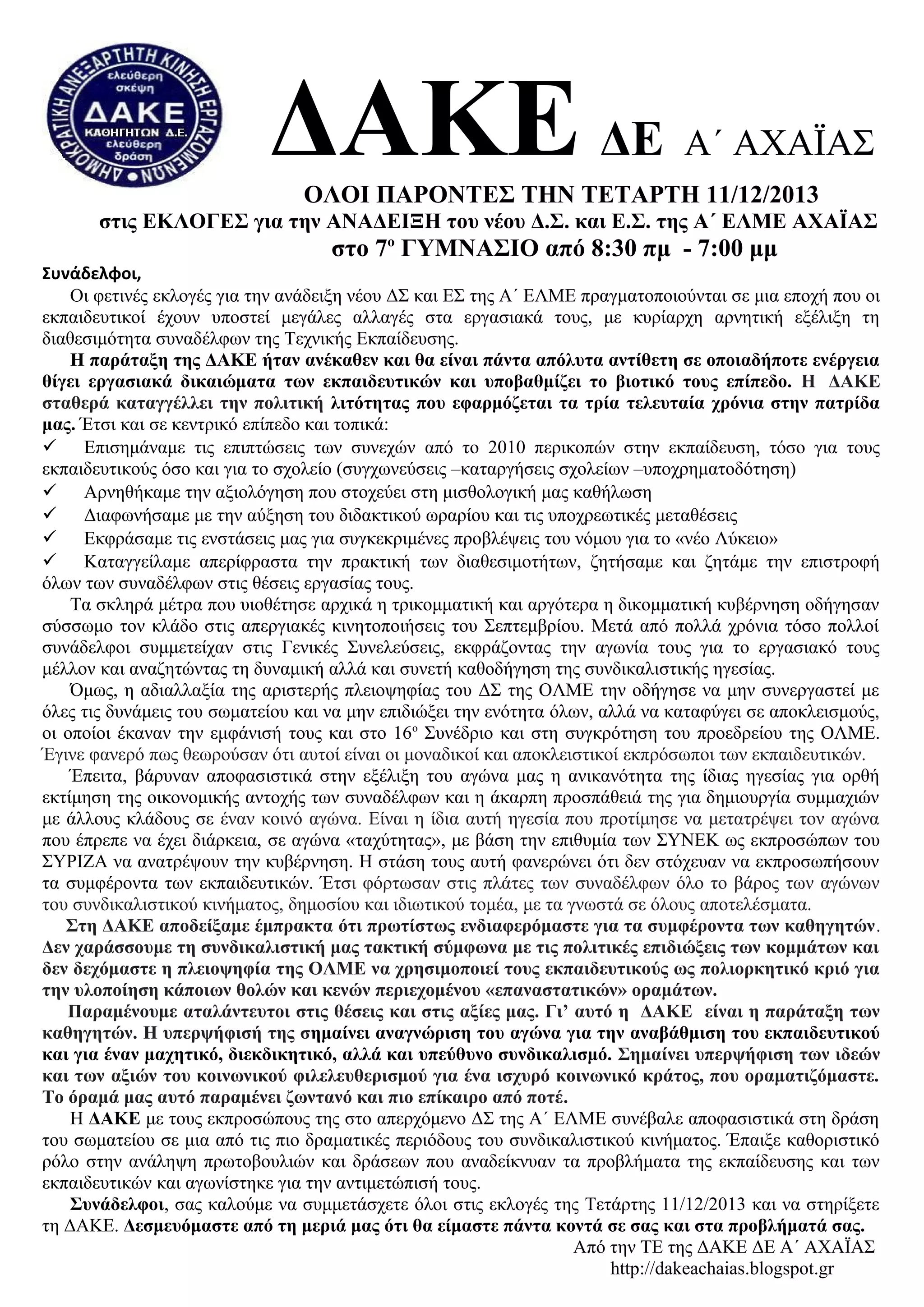 Συνάδελφοι, σας καλούμε να συμμετάσχετε όλοι στις εκλογές της Τετάρτης 11/12/2013 και να στηρίξετε