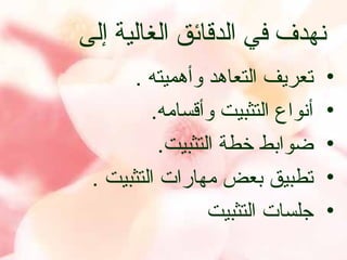 تتناول الوثيقة دورة مهارات تثبيت حفظ القرآن الكريم وتتعرف على مفهوم التعاهد وأهميته، وتستعرض أنواع التثبيت وأقسام خطته. كما تغطي الضوابط اللازمة لخطة التثبيت وتقدم مهارات تطبيقية، بالإضافة إلى وضع جدول أسبوعي للتثبيت.