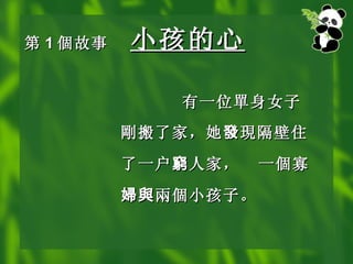 第 1 個故事 小孩的心 有一位 單 身女子 剛 搬了家,她 發 現 隔壁住了一户 窮 人家, 一 個 寡 婦與 兩個 小孩子。 - 3.