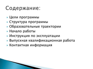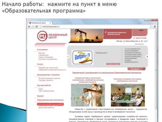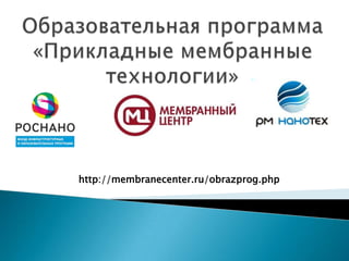 Документ описывает образовательную программу по мембранным технологиям, которая включает 15 дисциплин и четыре образовательные траектории для различных целевых групп. Программа доступна для дистанционного обучения и предусматривает возможность получения сертификата по итогам выполнения выпускной квалификационной работы. Включены тестовые задания для самопроверки и инструкции для начала обучения.
