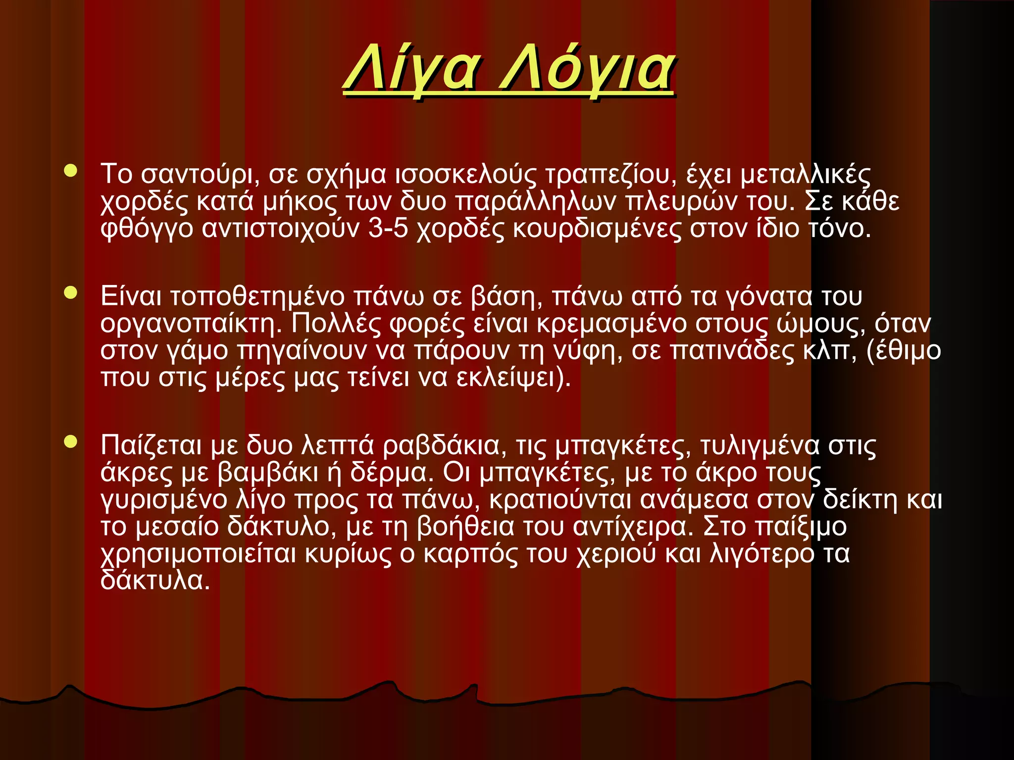 Το σαντούρι,σε σχήμα ισοσκελούς τραπεζίου, έχει μεταλλικές