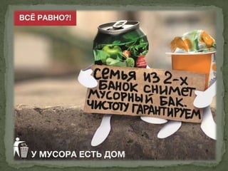 Документ обсуждает проблемы с отходами в поселке, подчеркивая отсутствие систематической утилизации и переработки мусора. В нем описываются виды отходов и их влияние на экологию, а также предлагаются решения для снижения загрязнения и повышения сознательности населения. Акцент делается на необходимости изменения привычек потребления и утилизации для улучшения общего состояния окружающей среды.