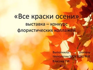 Выставка-конкурс флористических коллажей «Все краски осени» состоялась в школе, в ней участвовали учащиеся 6-7 классов. Победителями стали работы, такие как «Осенний бриз» и «Русская берёзка». Учитель Татьяна Ивановна благодарит всех участников и желает им творческих успехов.