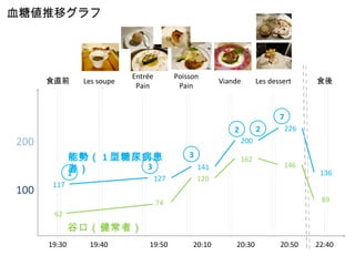 2013年世界糖尿病デー記念 糖尿病患者とサポーターのための日を楽しく過ごそう! ブルーサークル・イーブニングディナー in 横浜・名古屋 --- コース料理を食べるときに、 ・糖尿病患者の血糖推移がどのように変化するか ・健常者との違いがどれくらいあるのか これらを皆さんにわかりやすく提示するために資料をつくりました エリゼ光で同じコース料理を食べ、適宜血糖値を測定致しました。 また、能勢は食事にあわせて超即効型インスリンを投与しました(グラフの丸の中に服薬単位数を記載しています) より多くの方にコース料理の際の対応方法をご理解いただき、 安心して食事を楽しむきっかけにしていただければ幸いです! *本資料、自由にシェア・ご活用ください。 *活用される際、報告のみ admin@mystar-japan.org にいただけると幸いです。
