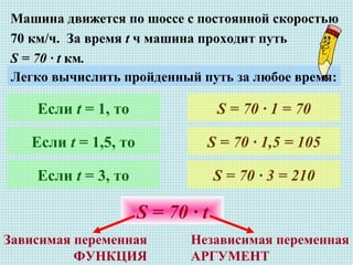 Документ объясняет основы функциональных зависимостей в математике, используя примеры движения автомобиля, скорости и площади фигур. Он иллюстрирует, как независимые переменные влияют на зависимые переменные и предлагает задания на нахождение значений функции и графиков. Кроме того, рассматриваются области определения и значения функций.