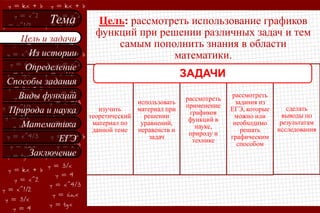 Документ рассматривает использование графиков функций в решении задач по математике, включая теорию, уравнения и неравенства. Обсуждаются различные виды функций и их графики, а также их применение в науке, природе и технике. Выводы основаны на анализе материалов, связанных с ЕГЭ и графическим методом решения задач.