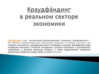 Документ описывает краудфандинг как процесс привлечения финансовых ресурсов от доноров через специализированные платформы для поддержки стартапов в реальном секторе экономики. Основная цель заключается в создании краудфандинговой платформы в виде онлайн-игры, которая будет способствовать привлечению микроинвестиций, а также развитию малого бизнеса и увеличению ВВП страны. В документе упоминаются основные доноры, реципиенты и планы по разработке экономической модели проекта.