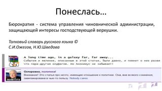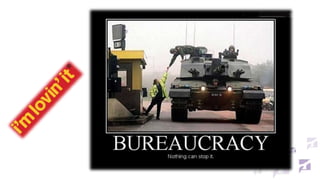 Документ обсуждает бюрократию как систему управления, подчеркивая её необходимость для достижения организационных целей, несмотря на критику за избыточность и формализм. Он рассматривает различные виды бюрократии и их особенности, такие как адхократия и аппаратная бюрократия, а также приводит мнения различных авторов по этой теме. Также затрагивается важность квалификации и чёткой иерархии в управлении организаций.