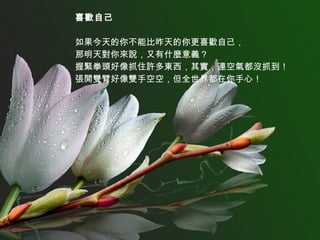 文档强调了自我接纳和积极心态的重要性,鼓励人们在生活中喜欢自己,摆脱多心和烦乱。通过认真对待自己的情感与需求,个体可以更好地应对生活的挑战,吸引积极的事物。最终,接受无常、理解得失之间的关系,将帮助人们自由自在地生活。